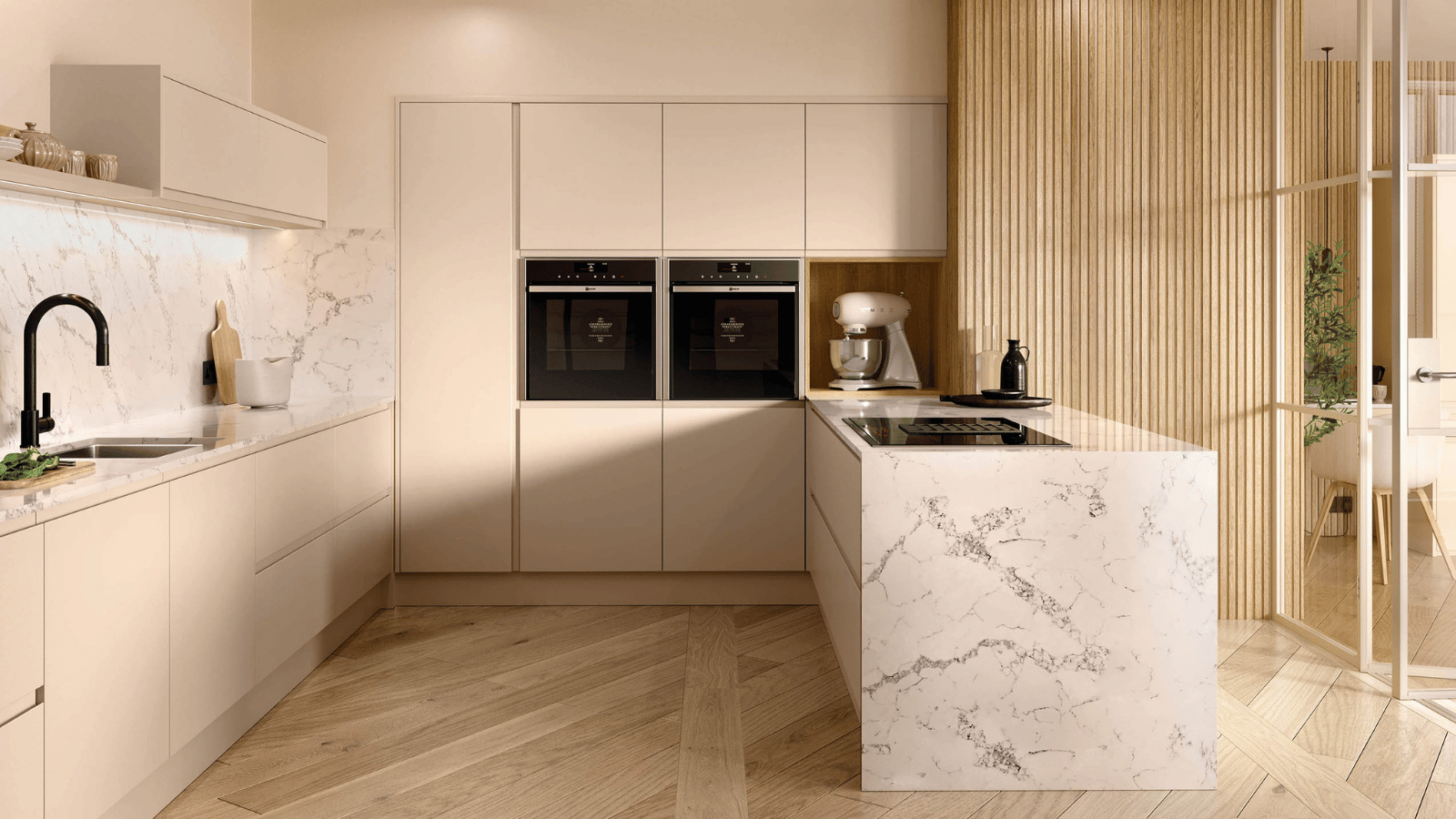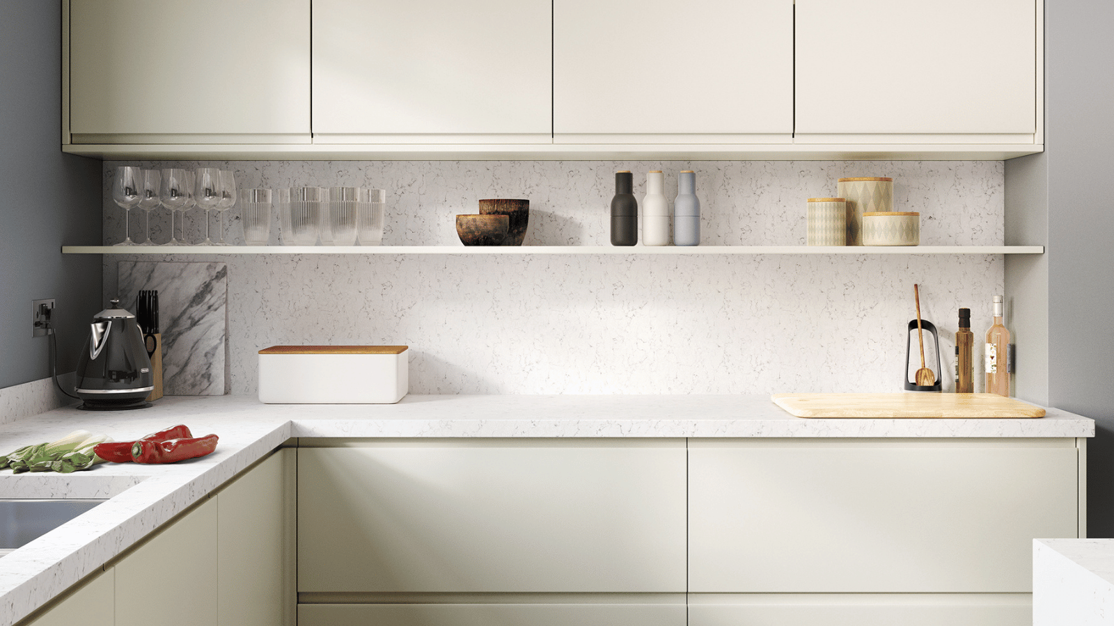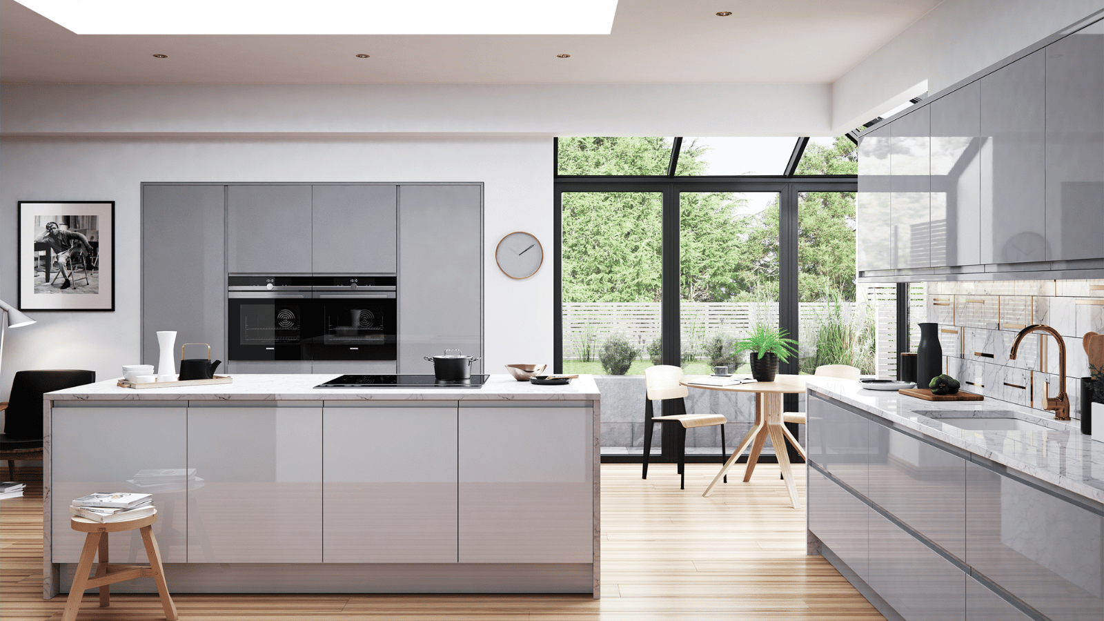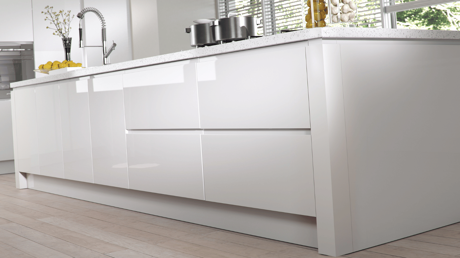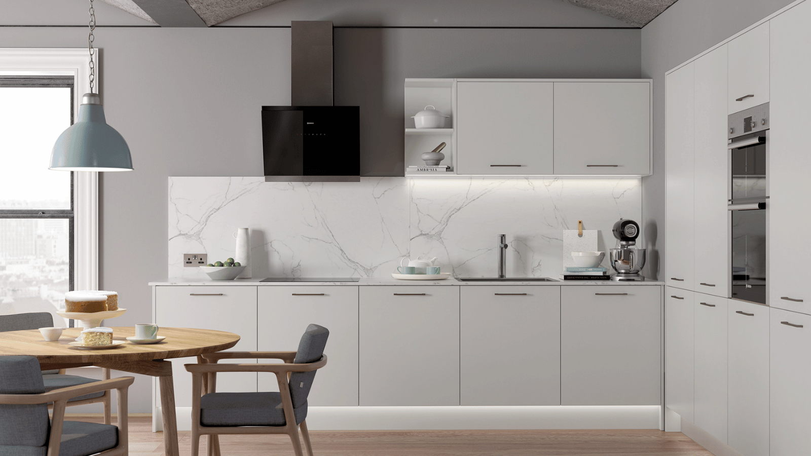Featuring a high-gloss slab and integrated J-handle, Strada Gloss reflects light beautifully, making it a bold yet timeless choice for bright, contemporary spaces.